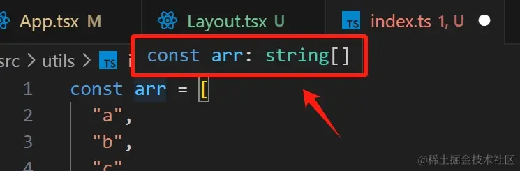 我们想要传入一个参数到str,而且这个参数必须是arr数组中的某一个元素,这时我们希望的是可以直接得到这个arr的联合类型,接下来一般我们会使用传统的方法去声明类型,如下: