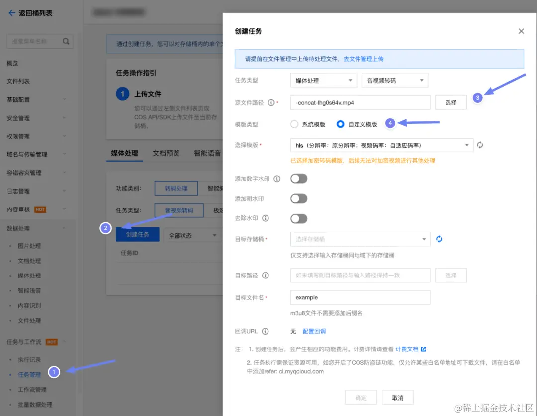 源文件路径选择刚刚上传的视频文件,模版类型选择自定义模版,选择第二步创建的hls转码模版,记住目标路径和目标文件名,产出文件就是我们需要的加密视频文件。