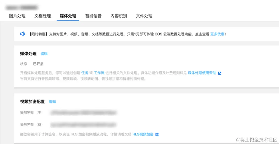 控制台媒体处理,视频加密配置模块,展示播放密钥(playKey,部署后端服务的时候会用到)