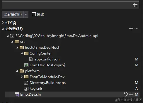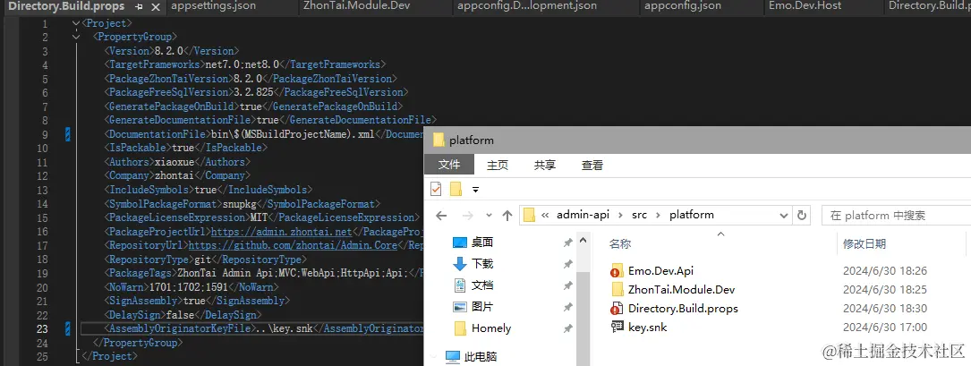 我这里是将Emo.Dev.Api的key.snk文件复制到了platform文件夹,并改了02.build/Directory.Build.props 中程序集签名的文件路径到 ..\kye.snk ,这样就可以让项目中的所有程序集就用这个前面文件