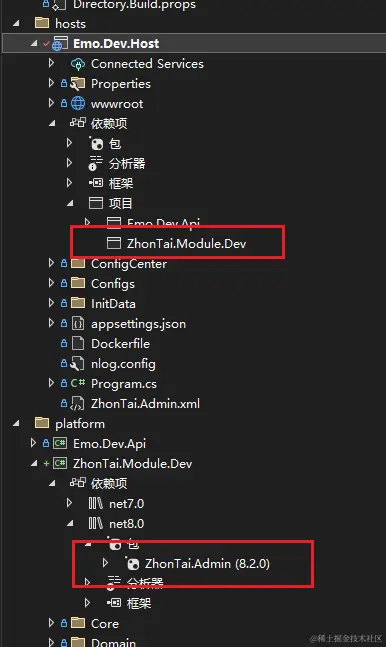 修改库中的引用,默认生成的 ZhonTai.Module.Dev.csproj 引用是相对源码的路径