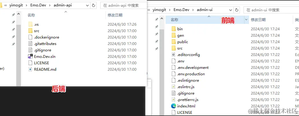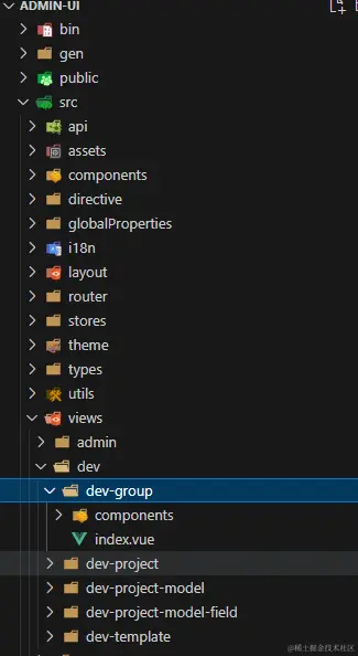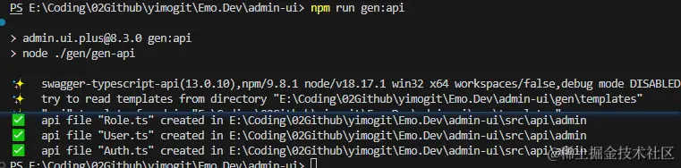 可以看到这里只生成了后端接口,目前 v8.2.0 还不支持前端代码的生成,所以我们还需要手动去将对应版本的 前端代码 下载一份到项目中(只保留),并调整下目录结构,前端代码放到 admin-ui ,后端代码放到 admin-api