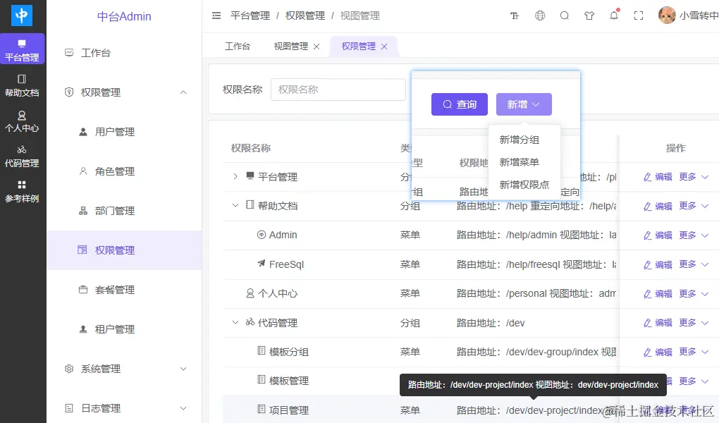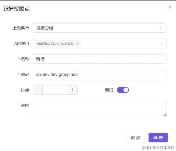 - 【分组】为一级菜单,【菜单】为二级菜单,【权限点】对应为按钮