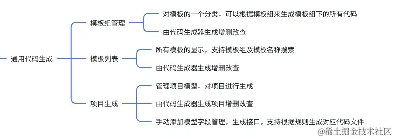可从脑图中看到,基本除了项目生成这块需要添加代码,相关模块的增删改查都可以由代码生成器来生成