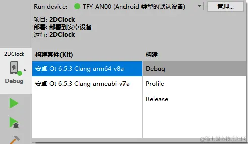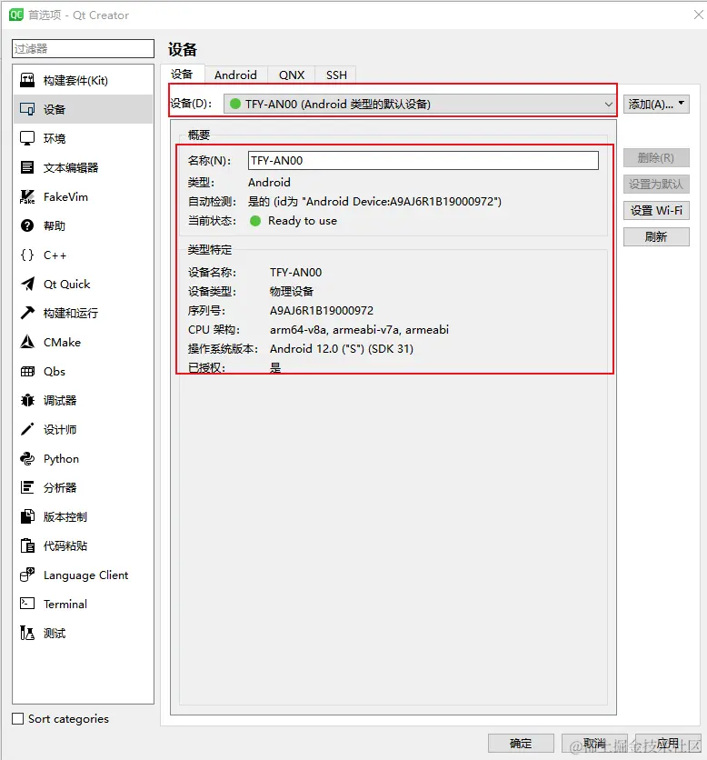 此时我们先去这个界面连上真机,如果没出现,刷新一下,或者重启Qt Creator等等。【这里我之前是用苹果手机分享热点给华为手机,华为手机才是真正的真机调试,关闭热点刷新成功】