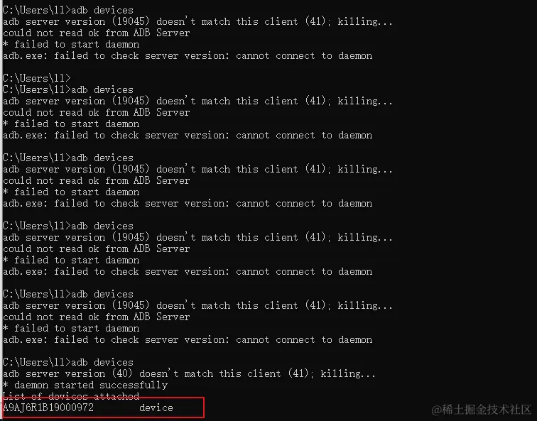 【2】此时在命令行连续输入adb devices 然后就连上了,你说奇怪不奇怪;