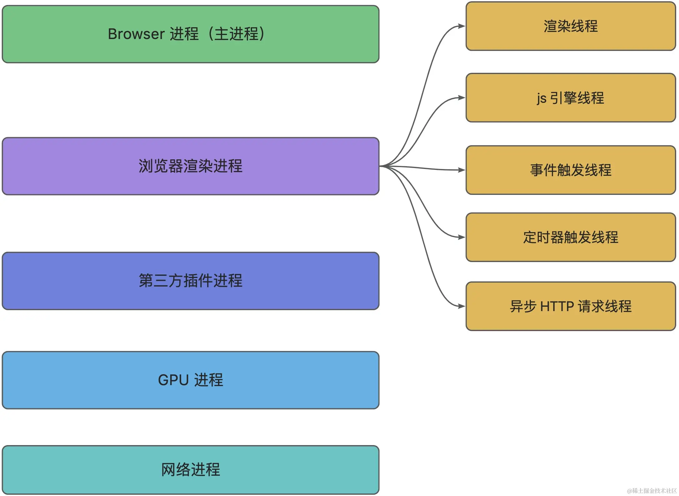 - 事件触发线程:归属于浏览器而非 JS 引擎,用于控制事件循环。当来自 JS 引擎线程(如执行