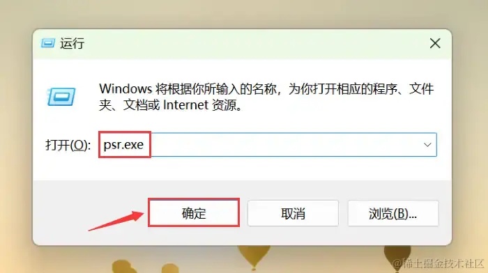 步骤记录器也是电脑自带的录制视频工具之一,步骤记录器主要能记录下您在电脑上操作的所有步骤。但它无法为您录制出声画同步的视频。其使用方法是:使用快捷键 【Win+R】 打开电脑【运行】页面。在输入框中输入 【psr.exe】 ,点击 【确定】 即可帮您记录操作步骤。