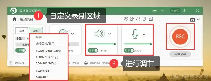 第三步:在录制前。可以自定义录制区域,也可对摄像头、麦克风等进行调节。调节完毕点击 【REC】 进入录制。