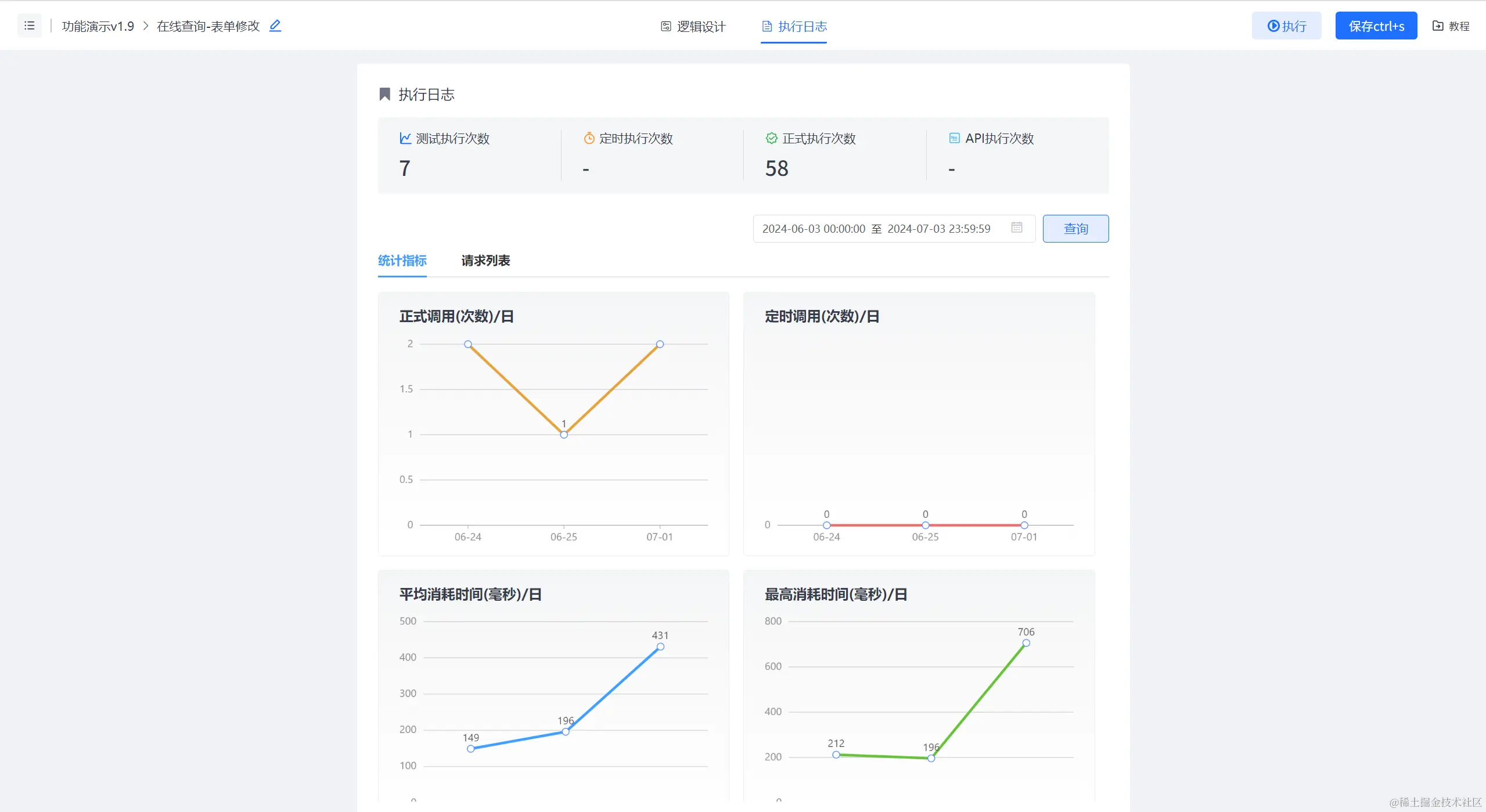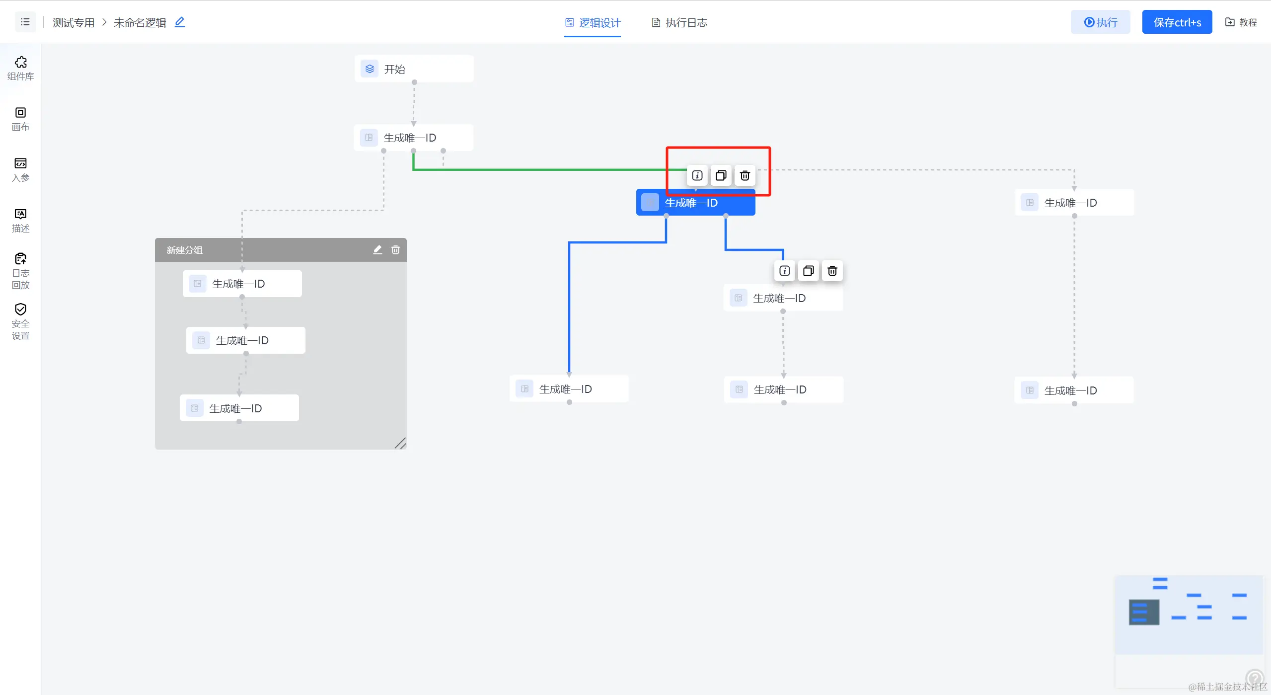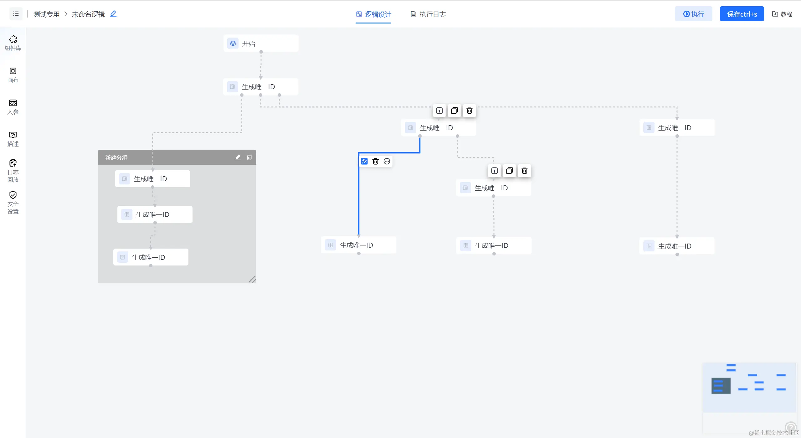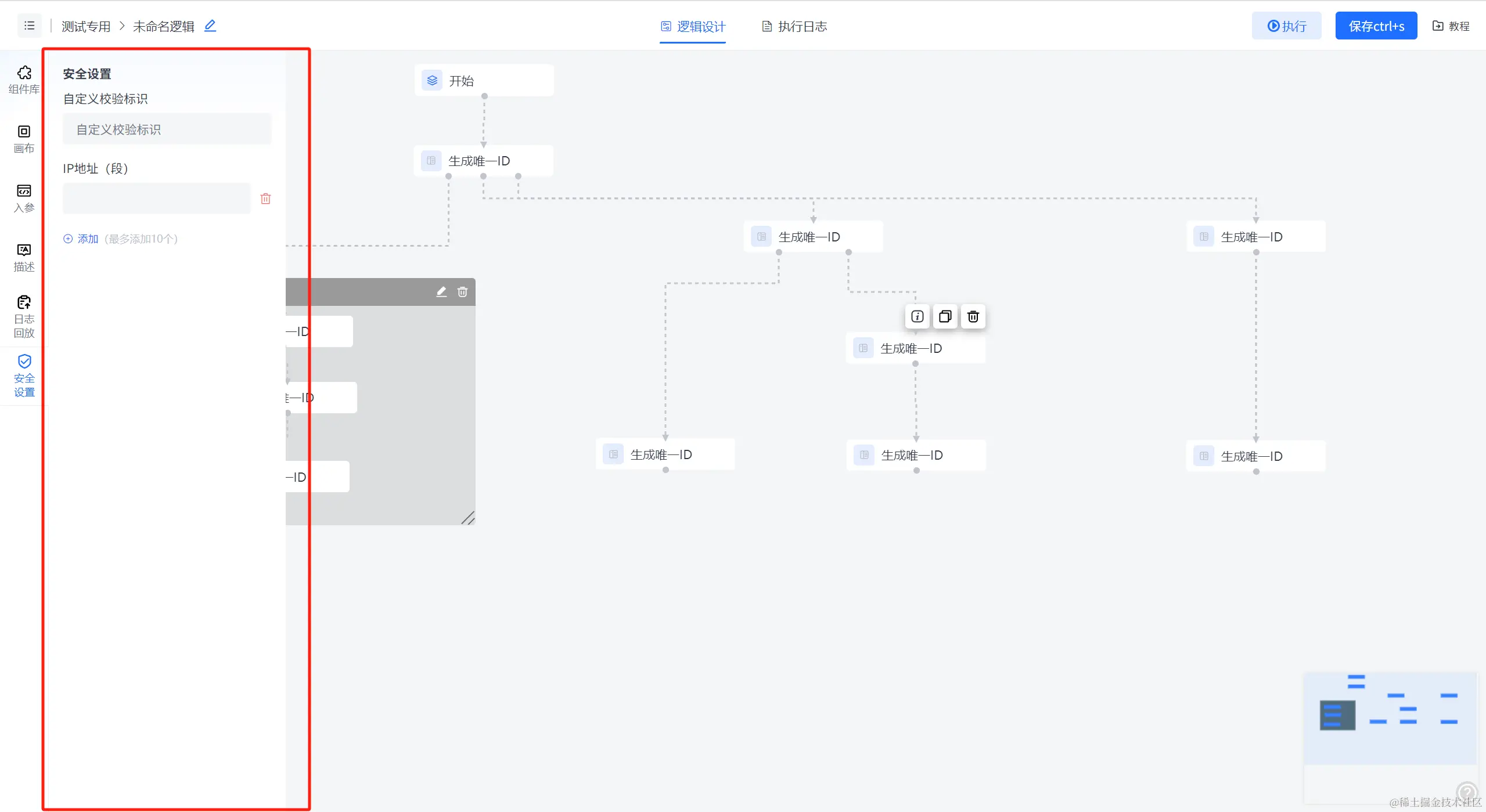 5、优化了逻辑的编辑操作导航,集成组件列表、画布切换、入参设置、逻辑描述、日志回放、安全设置;
