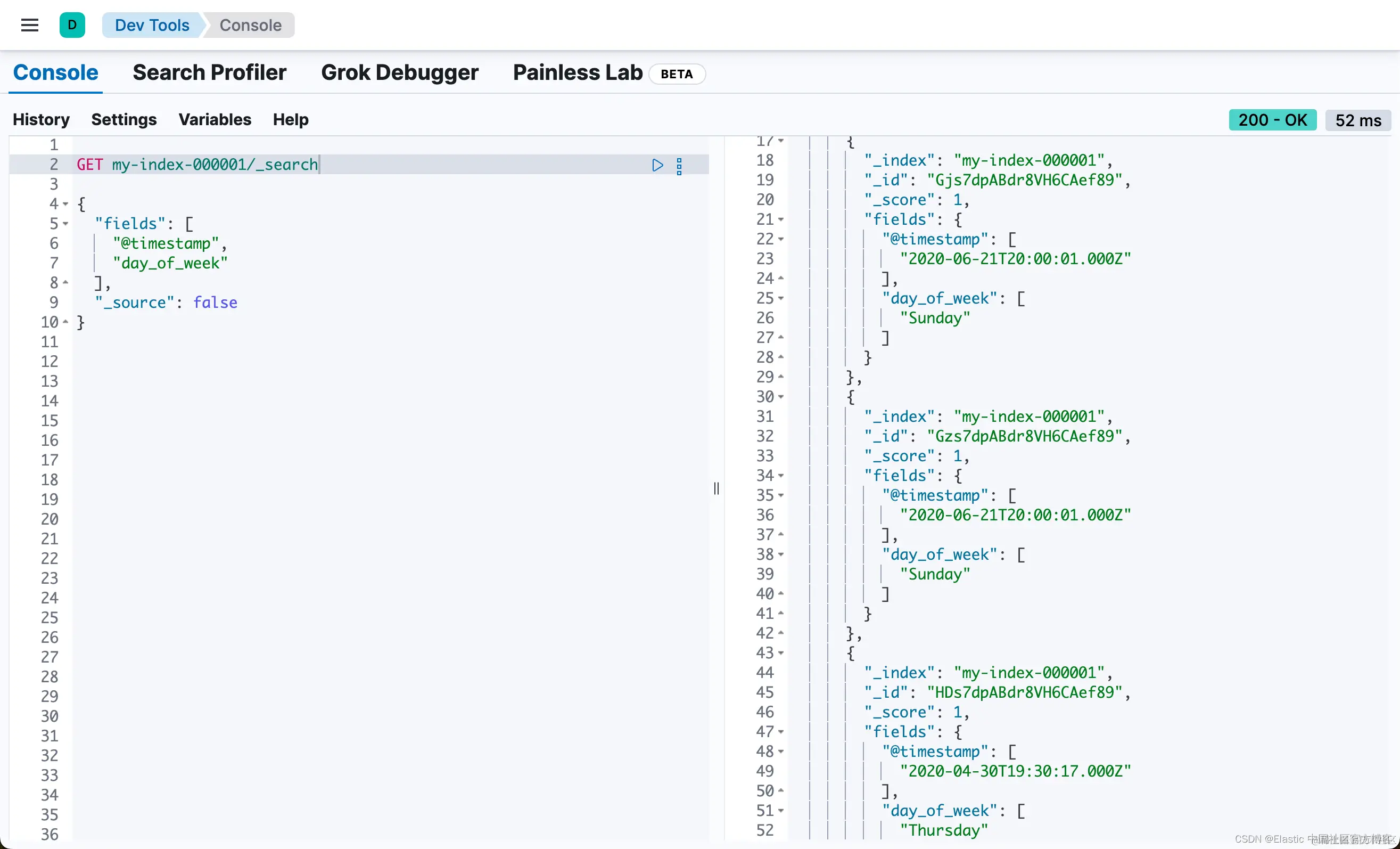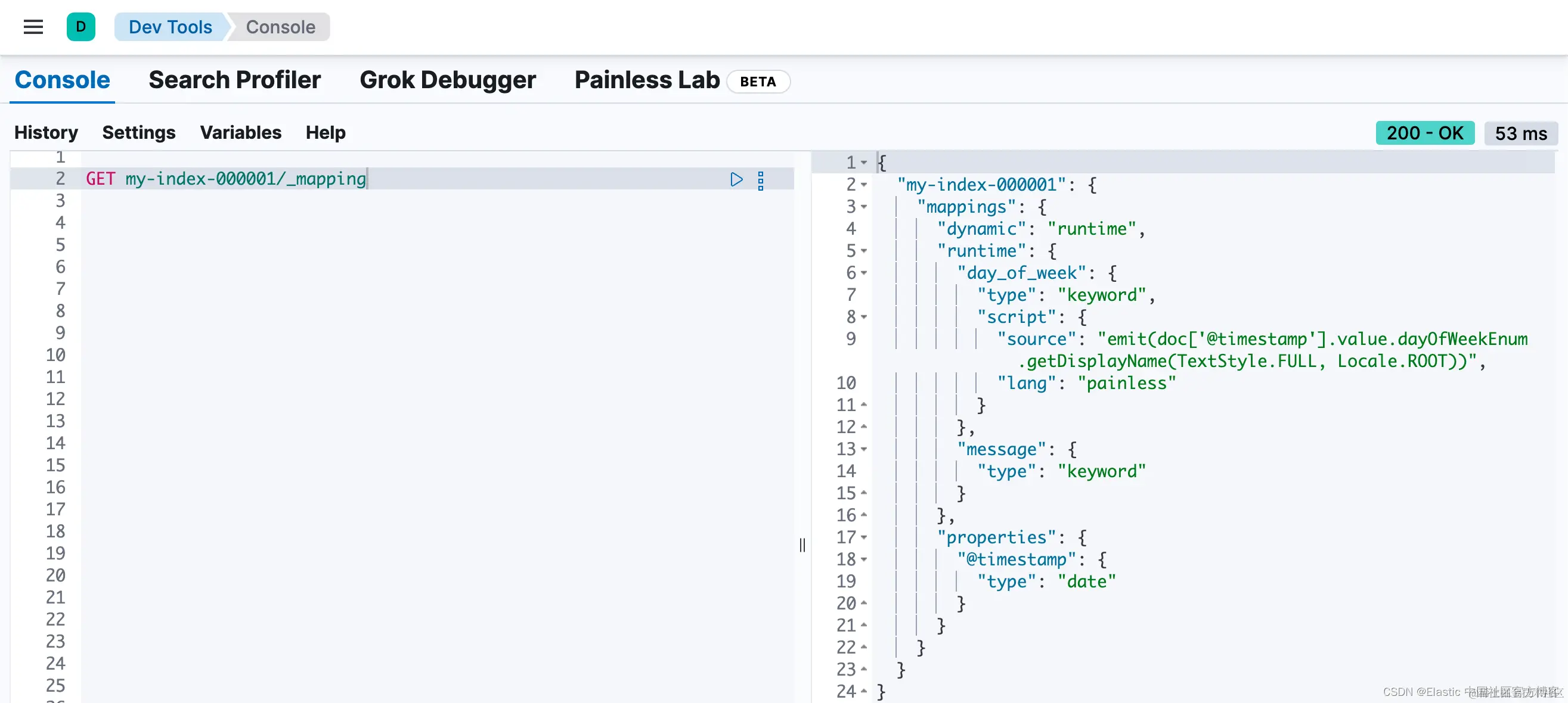 你知道日志数据包含要提取的特定字段。在本例中,我们希望重点关注 @timestamp 和 message 字段。通过使用运行时字段,你可以定义脚本来计算搜索时这些字段的值。