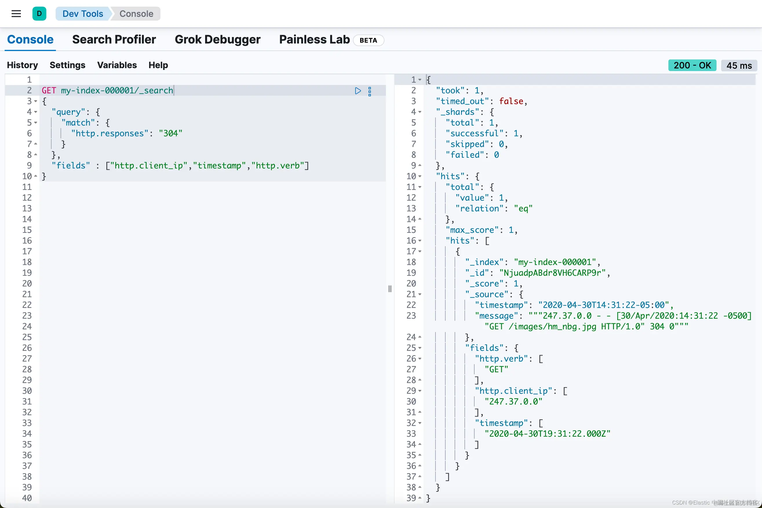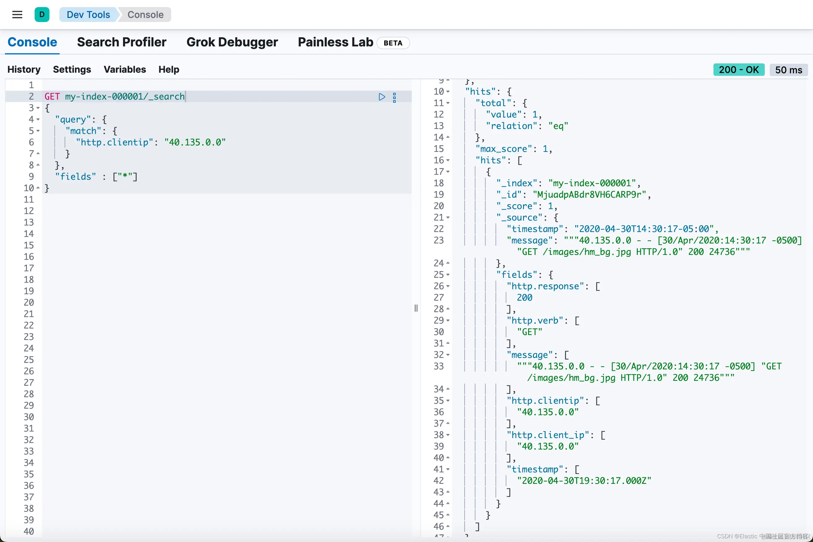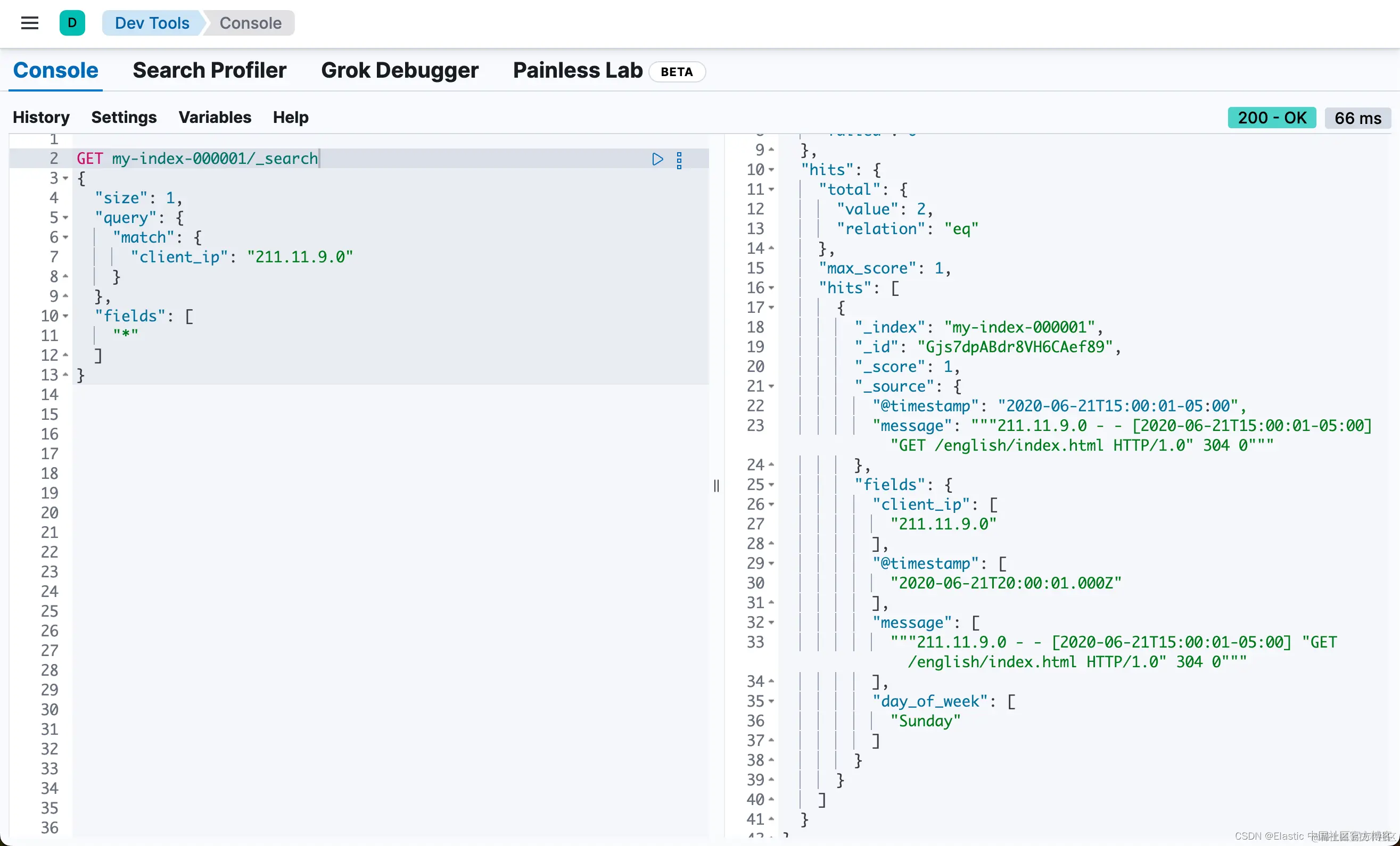 或者,你可以在搜索请求的上下文中定义相同的运行时字段。运行时定义和脚本与之前在索引映射中定义的完全相同。只需将该定义复制到搜索请求的 “runtime_mappings” 部分下,并包含与运行时字段匹配的查询即可。此查询返回的结果与你在索引映射中为 http.clientip 运行时字段定义搜索查询的结果相同,但仅限于此特定搜索的上下文: