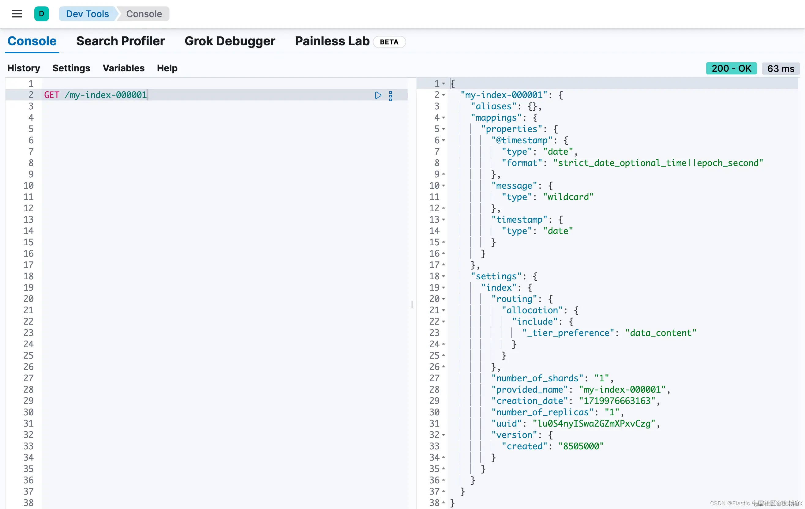 你可以从一个简单的示例开始,将 @timestamp 和 message 字段作为索引字段添加到 my-index-000001 映射中。为了保持灵活性,请使用 wildcard 作为 message 的字段类型: