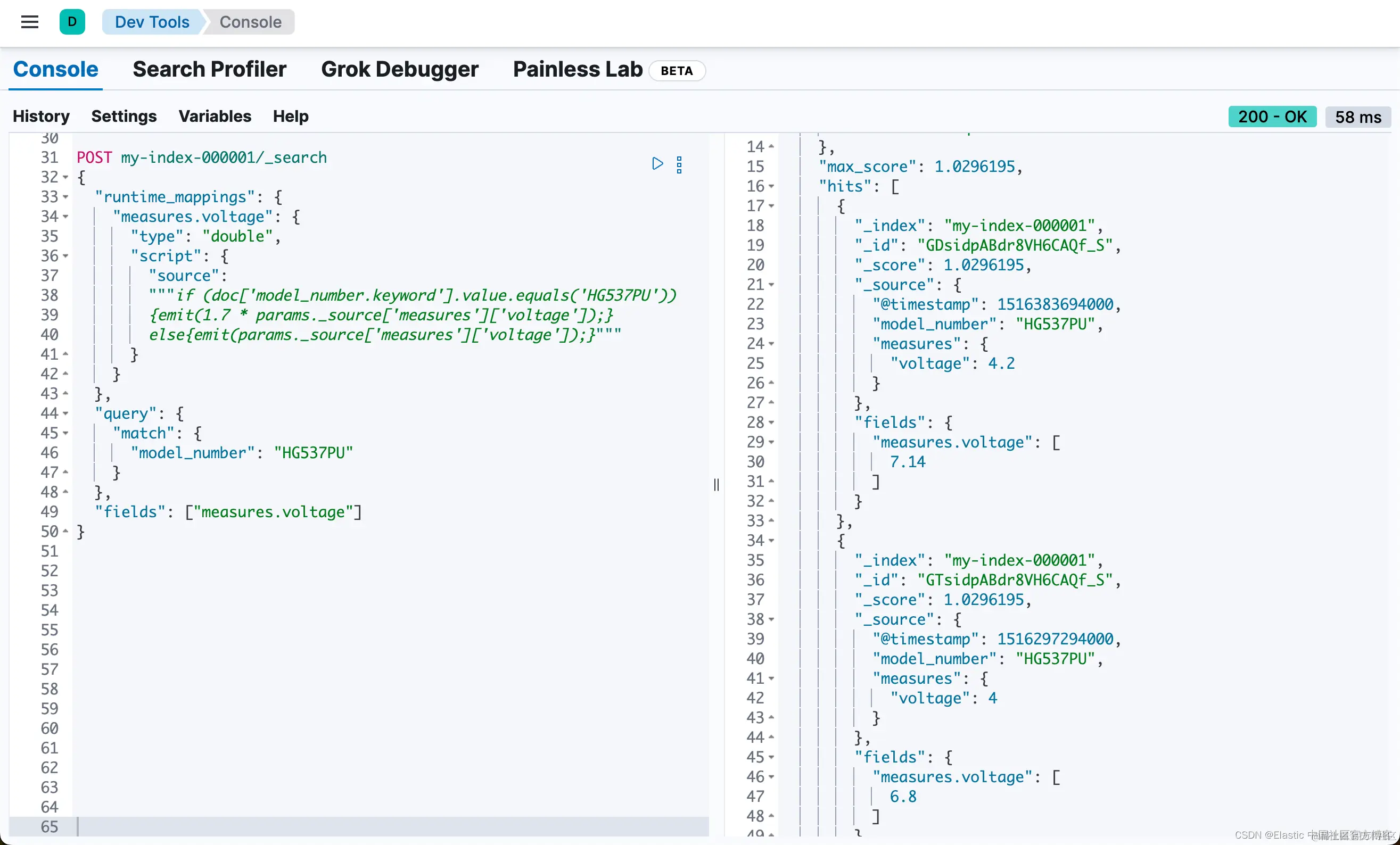 以下请求定义了一个运行时字段,其中脚本评估 model_number 字段,其值为 HG537PU。对于每个匹配项,脚本将 voltage 字段的值乘以 1.7。