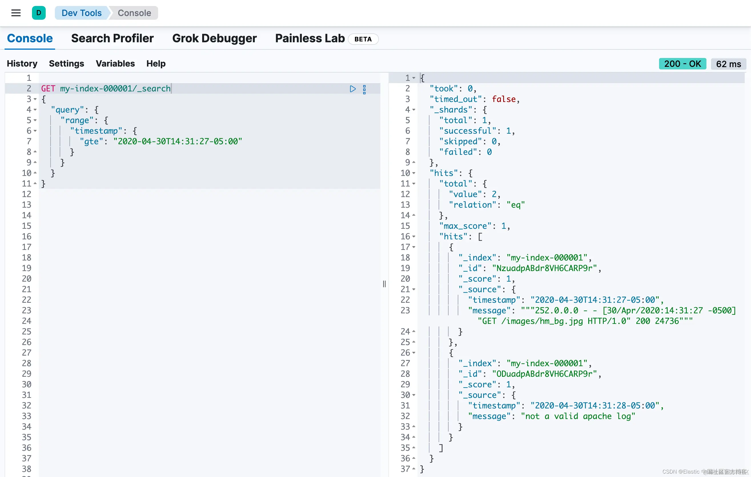7. String clientip=grok('%{COMMONAPACHELOG}').extract(doc["message"].value)?.clientip;