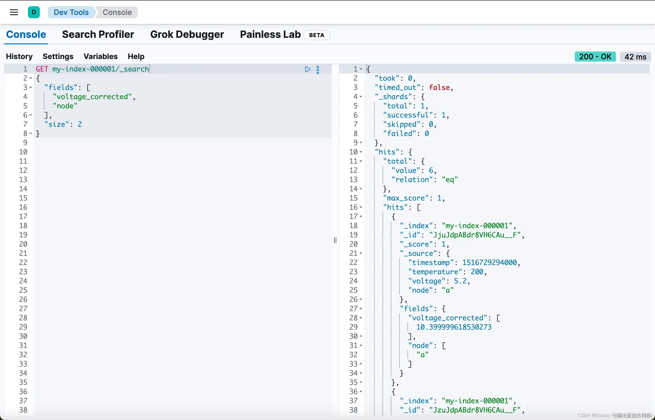 查看响应,每个结果的 measures.voltage 计算值分别为 7.14 和 6.8。这更像了!运行时字段在搜索请求中计算了此值,但没有修改映射值,该值仍会在响应中返回。