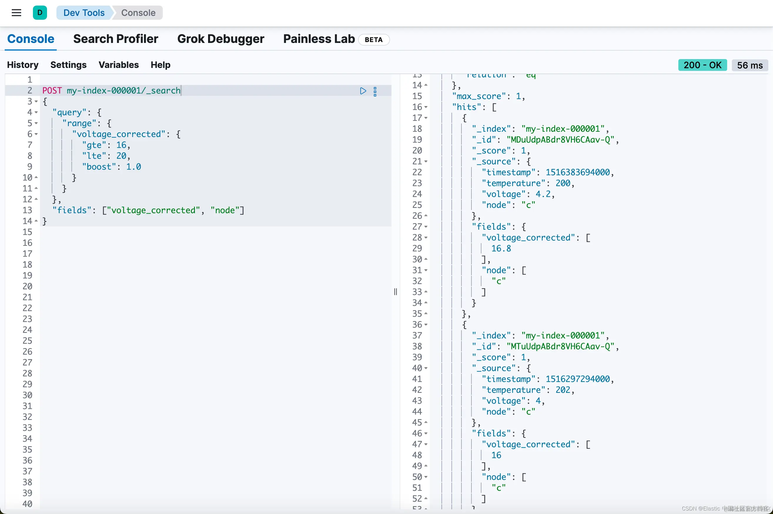 你现在可以在搜索查询中检索计算值,并根据精确值查找文档。以下范围查询返回计算出的 voltage_corrected 大于或等于 16 但小于或等于 20 的所有文档。同样,使用 _search API 上的 fields 参数来检索所需的字段: