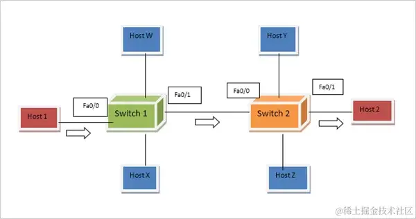 如果给网络中的两个交换机添加一个名为fast Ethernet 0和fast Ethernet 1的接口卡(通常表示为Fa0/0)来配置 VLAN,来自主机1的广播消息将仅发送到主机2。