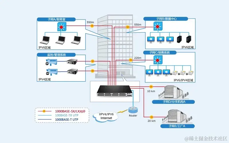 二层交换机主要用于网络接入层和汇聚层,而三层交换机主要用于网络核心层,但是也存在少部分三层交换机用于汇聚层的现象,下图是三层交换机的实际应用实例。