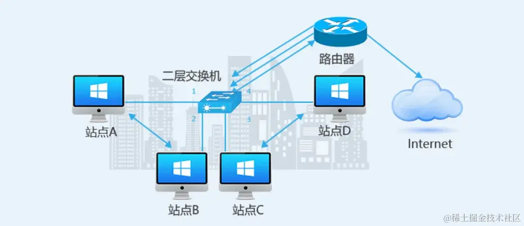 使用一个或多个交换机组成的以太网,所有站点都在同一个广播域。 随着交换机变多,这个广播域的范围也会变大,于是就会出现难以维护、广播风暴以及安全等问题。