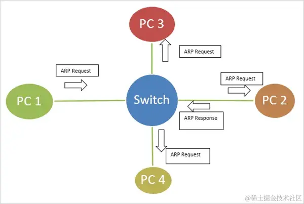 因此,交换机向所有端口发送ARP请求(不包括PC1所连接的端口),PC2收到ARP请求后,将回复一个带有其MAC地址的ARP响应消息。
