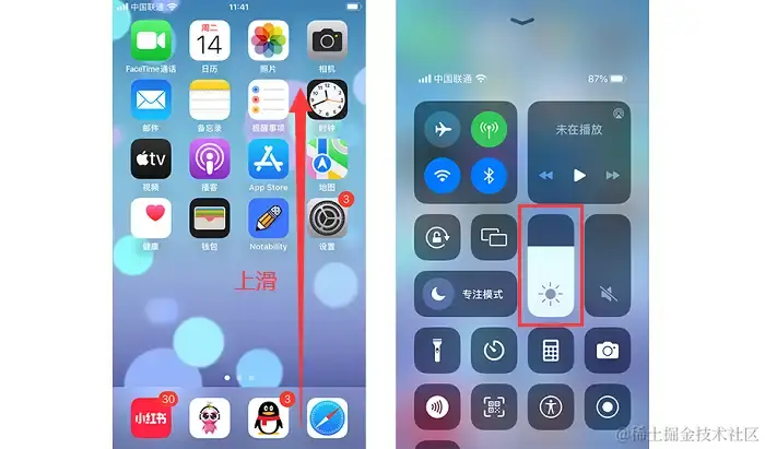 步骤2:控制中心中有一个带有太阳图标的亮度调节滑块。