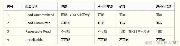 特别需要强调的是,在KES数据库中,Read Uncommitted隔离级别下不允许出现脏读现象,而Repeatable Read隔离级别则会防止幻读的发生。既然这些情况已经被明确提出,我们有必要实际实施一下,以验证这些说法是否属实。