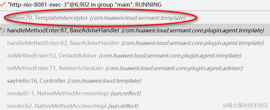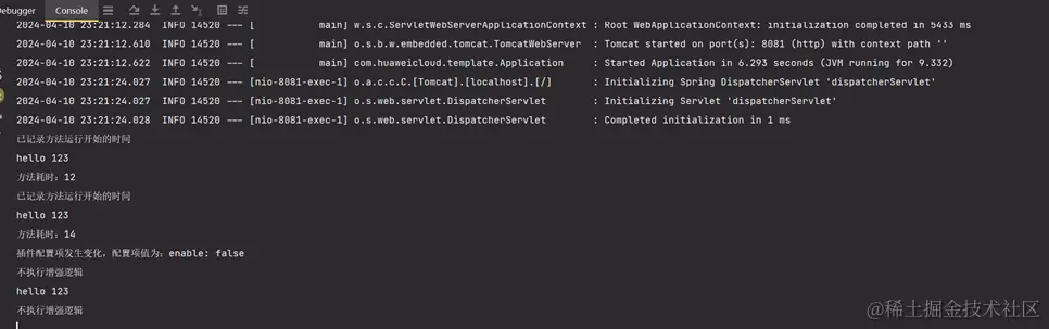 可以看到我们执行first-plugin-demo这个示例的时候:会发现我们执行业务方法的时候,它就会进行织入拦截器,执行对应的onMethodEnter和方法执行完后的onMethodExit方法。