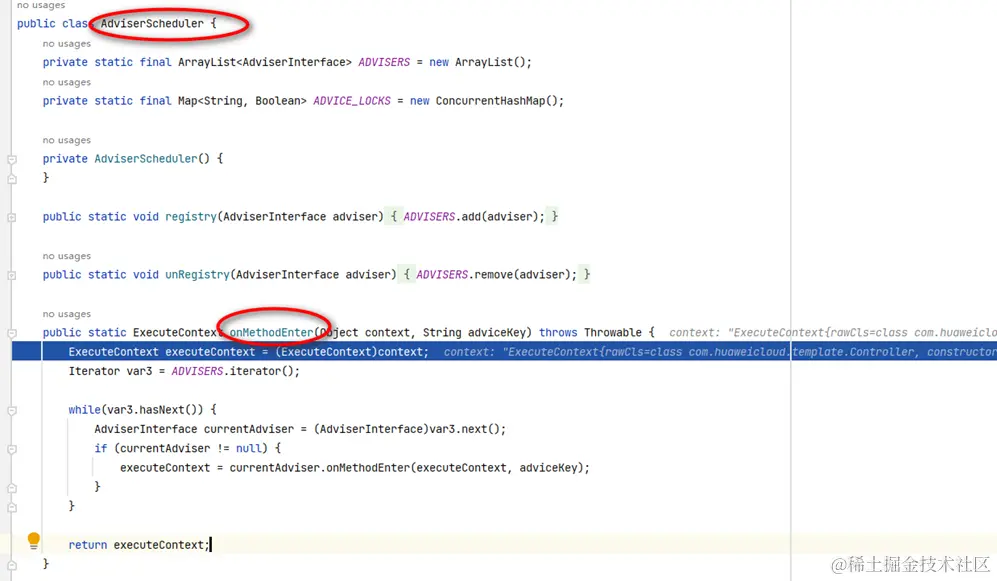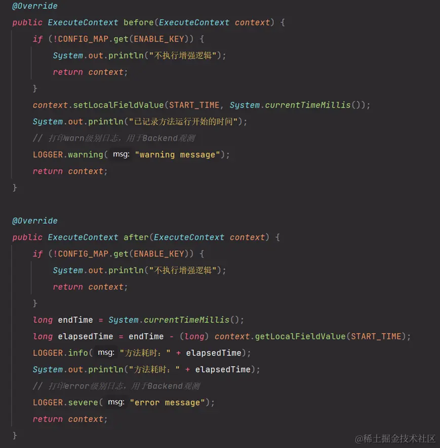 这两个方法和byte-buddy中的使用实现的功能是类似的。在需要拦截的方法中执行织入的逻辑。