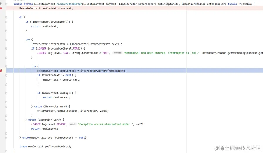 完成拦截进入到业务方法中,实现拦截功能的织入。然后进入后置拦截,完成after的拦截逻辑。