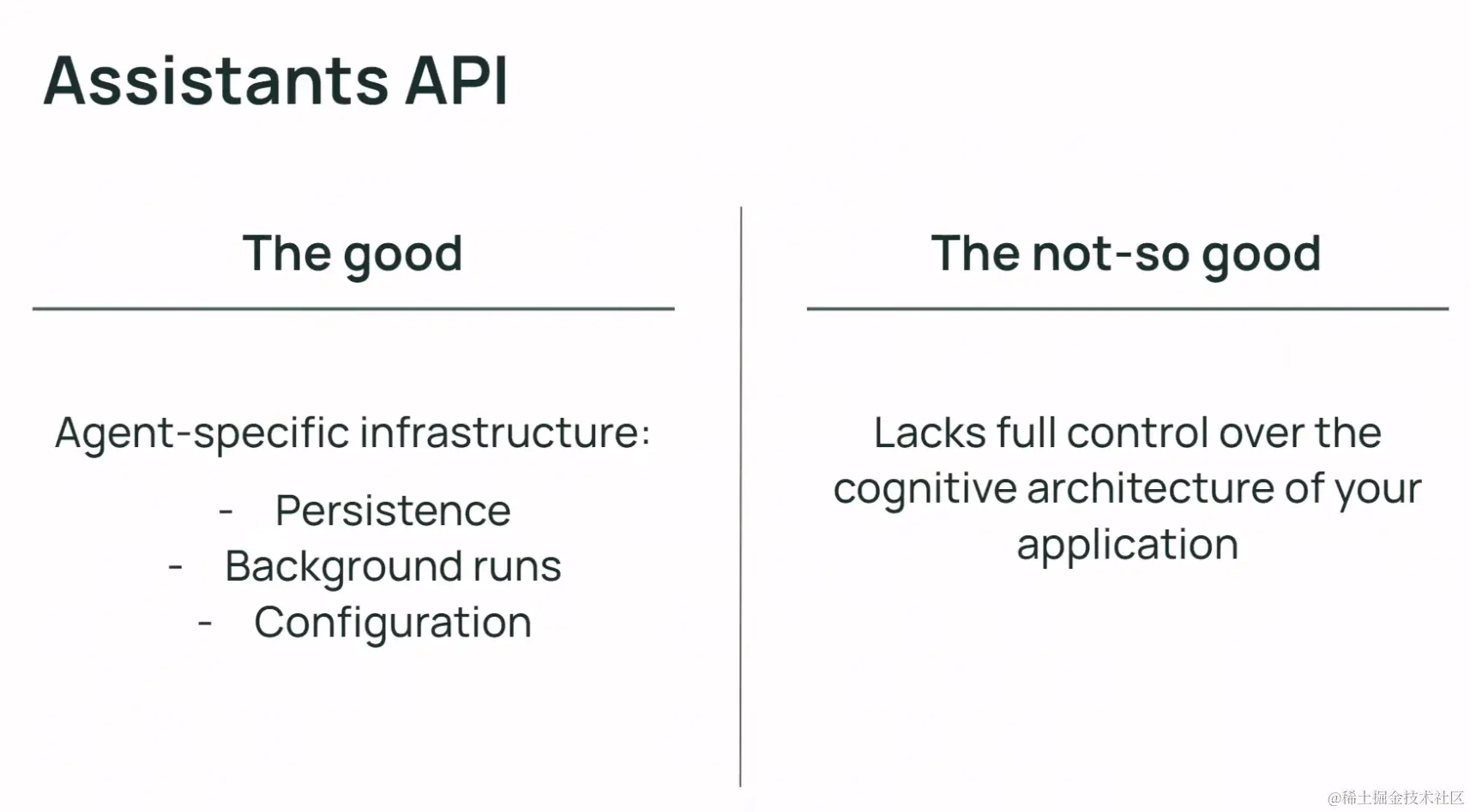 然后,他回到了 OpenAI 助手 API,他说这是一个很好的代理平台,尽管它有一些缺陷。“它附带了一个特定状态,它期望您的应用程序具有该状态,一个消息列表,而且它有点僵化,不允许您轻松地执行除该状态之外的其他操作,”他说。