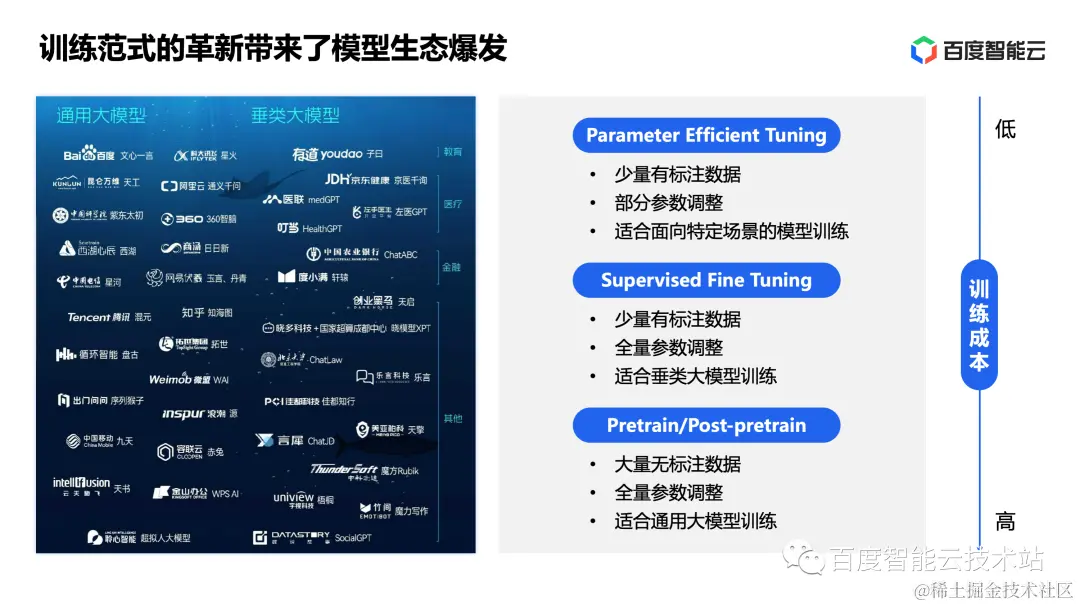 为什么会在短期内出现这么多的大模型呢?这和大模型新的训练范式以及开源模型生态快速发展有极大关系。我列举了三种大模型的训练方式,从上往下看,成本由低到高变化。