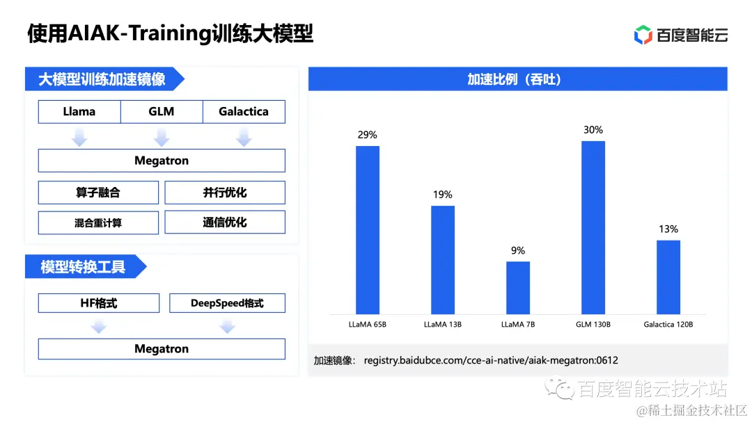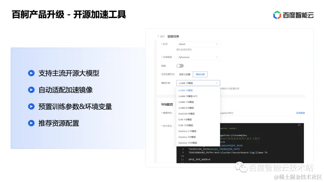 面向大模型场景,我们提供了更多新的工具,主要是面向典型开源大模型的训练和推理的加速镜像以及配套的工具。接下来我展开介绍一下。
