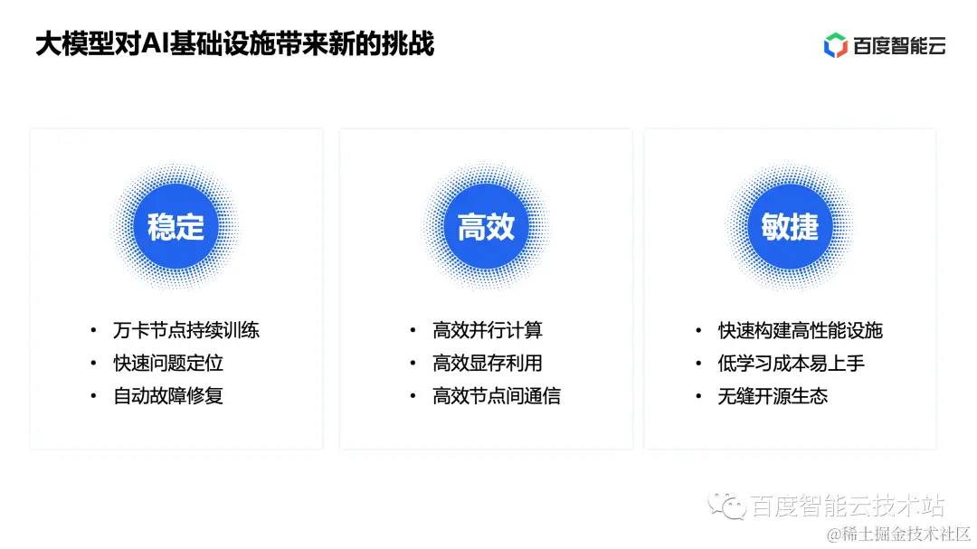大模型对异构计算基础设施的新挑战,主要在稳定,高效和敏捷等三个方面。