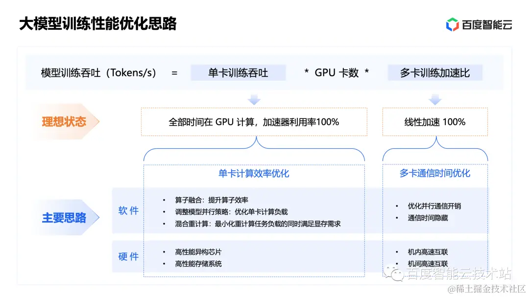 我们可以从硬件和软件两个层面来做优化,硬件优化包括了高性能异构芯片、高性能存储系统,以及和机内机间的高速网络。在软件层面我们通过算子融合、模型并行策略的调整和合理的调整重计算机制,优化单卡计算效率。这里其实有一个隐含约束,所有的优化都要考虑计算精度不退化同时超大的模型参数不会撑爆宝贵的显存资源,另外我们也通过优化并行通信和链路开销进一步提升多卡线性加速能力。
