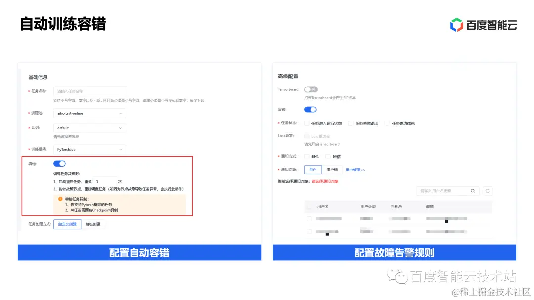 在任务容错场景,我们提供了较为方便的使用方式。在提交训练任务时,我们可以选择开启容错训练,并配置自动重启次数。当训练任务故障时,我们会根据配置首先尝试本地重启,并在多次尝试失败后隔离故障节点,将任务调度到健康的节点上重新启动,同时拉取最近的 CKPT 继续未完成的训练。