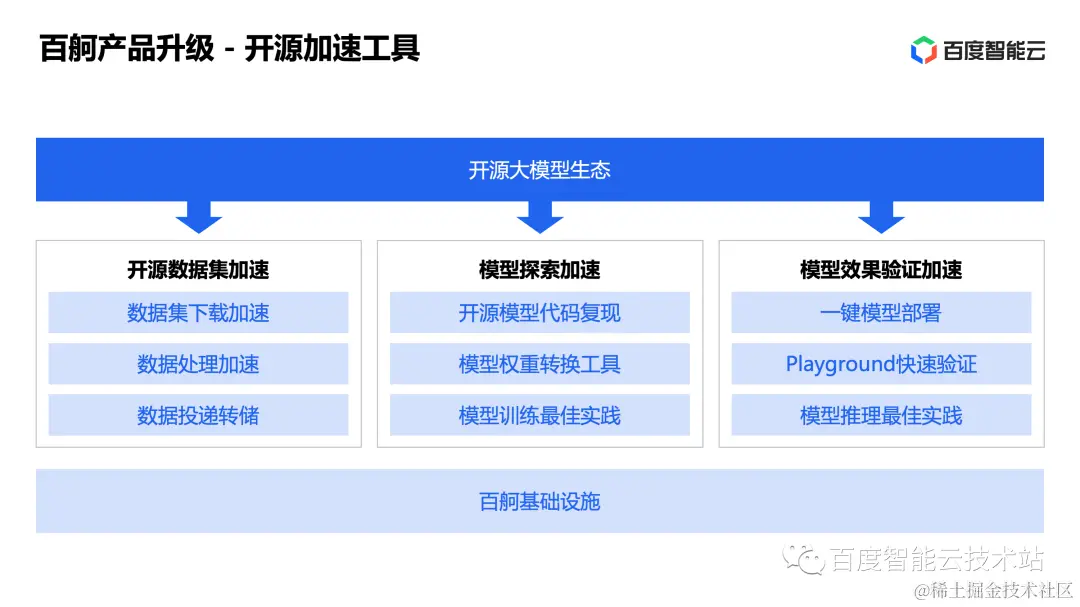 基础设施包括了高性能计算节点,可以支持英伟达 A800、H800 这类高性能 GPU,同时也支持百度自有的昆仑芯片。存储方面提供对象存储 BOS、并行文件存储 PFS,同时也提供了本地的 NVME SSD,支持模型调试、训练、推理等全场景存储需求。存储在大模型场景的加速方案,我们在本次云智公开课的第 3 期给大家做了比较全面的介绍。高性能网络方面我们提供了高性能的 RDMA 网络、支撑业务高速访问和隔离的 VPC 网络,这部分在我们的第 1 期也给大家做了详细介绍。
