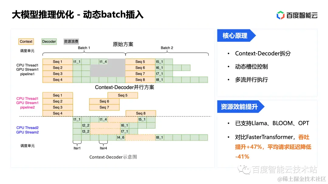首先,把上下文处理过程和内容生成环节拆分开,不再统一调度。其次,通过动态槽位控制机制重新组合这些计算请求,尽量填满计算单元的时间片。同时也将多个流之间的调度方式拆散,每个流都可以独立的动态组装计算任务。
