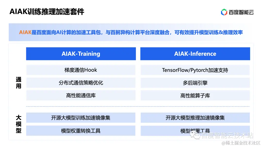 首先介绍一下 AIAK。AIAK 是百度智能云面向 AI 计算推出的 AI 加速套件,和百舸平台深度融合,可以有效的提升模型训练效率和推理效率。AIAK 在之前的版本中就提供了梯度通信 Hook、分布式通信策略优化、高性能通信库等训练优化工具以及多框架多引擎加速,高性能算子库等推理加速能力。当然,这些能力在大模型场景下会不同程度上的复用。