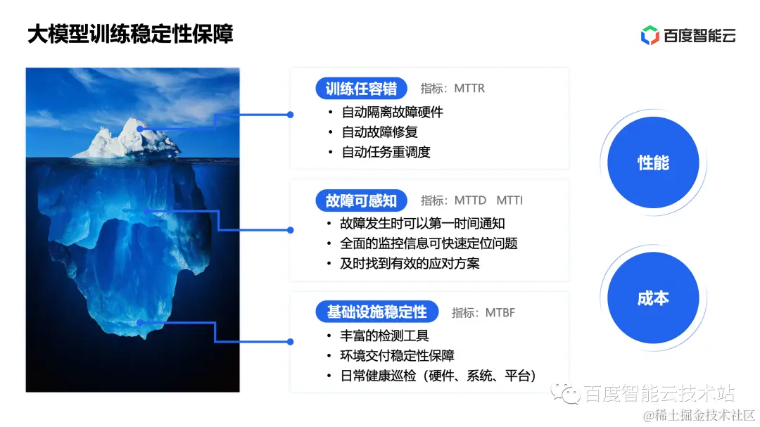 由于大模型训练是一种大规模离线型计算,所以实际上这些稳定性指标最终支撑的还是训练成本,所以稳定性建设的一个隐含约束就是训练的性能和成本不能显著衰退,不然就会舍本逐末。
