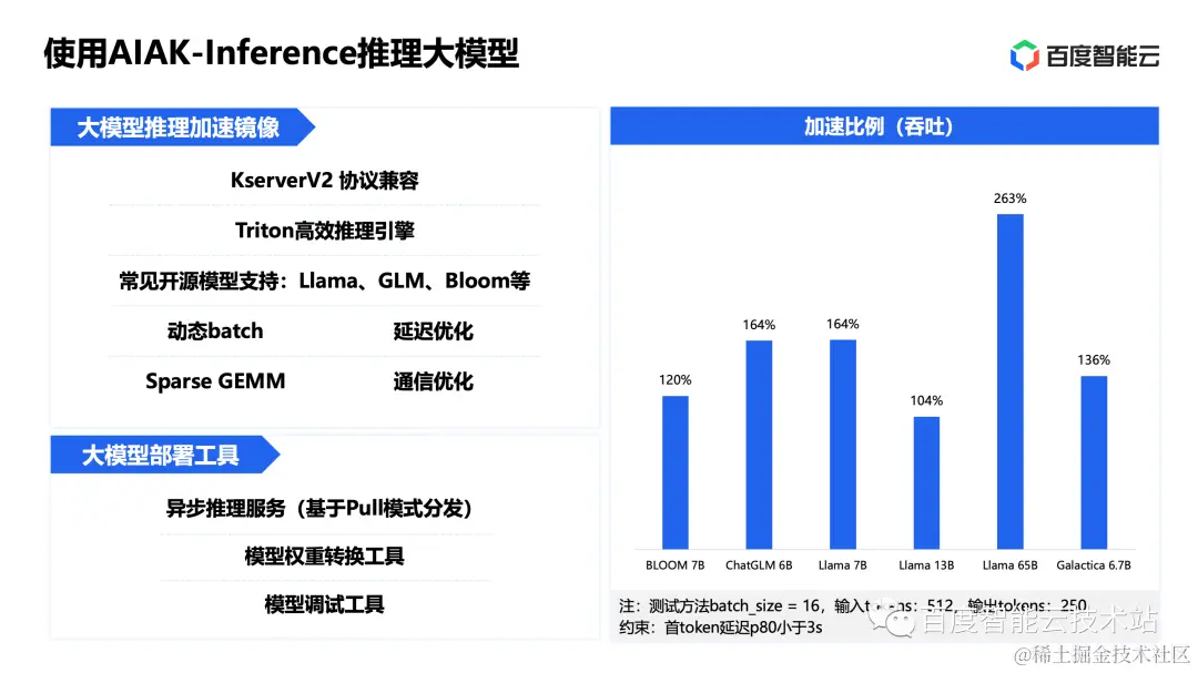 百舸平台提供了大模型的部署工具,包括了完整的异步推理服务和模型权重转换工具,让推理更加高效。还提供了一些模型调试工具,帮助用户快速体验加速效果。右面是我们的一些实测数据,在保障首 token 延迟可控的前提下,使用 AIAK-Inference 的推理加速方案,主流大模型的吞吐均可提升 1-2 倍,大幅降低了推理成本。