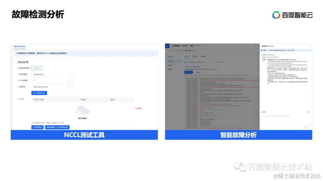 首先是 NCCL 测试工具,NCCL tests 是一个检测节点间通信性能的测试工具,用户可以选择需要测试的通信类型、GPU 数量和目标资源池展开测试。我们可以通过和基准性能指标做比对,发现大多数的硬件故障带来的通信问题,并通过二分查找法定位故障点。