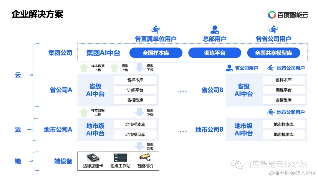 对于大型的企业,智能化升级的需要显然不是几个模型就可以满足的,他需要一整套完整的企业级解决方案。例如大型企业将业务布局在全国及下属的各类子公司,如何管理企业中不同层级的子公司对 AI 能力的建设、使用和共享,如何协同云边端的 AI 能力,都需要企业解决方案来实现。