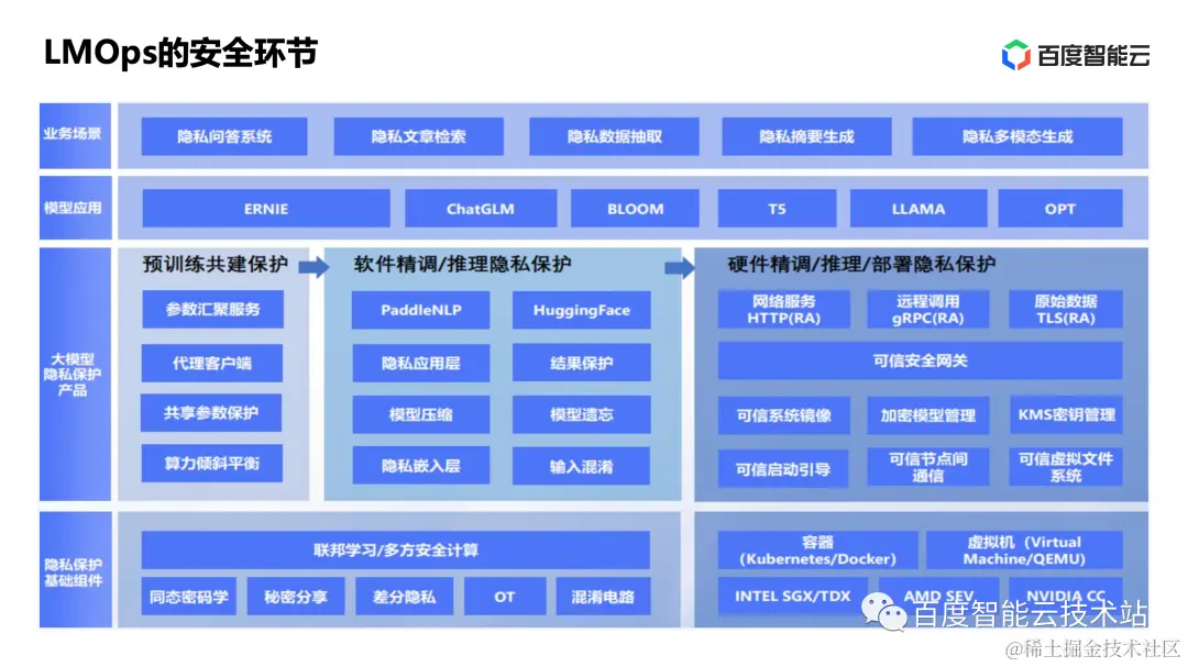 下图为大家详细介绍的千帆大模型平台就在安全方面做了大量的优化工作。比如千帆大模型平台进行数据加密(包括同态加密、差分隐私等)、为训练环节提供可信的计算环境(包括沙盒环境等),以及在大模型完成部署进行推理的时候如何对数据进行加密、针对用户的隐私数据进行脱敏等。