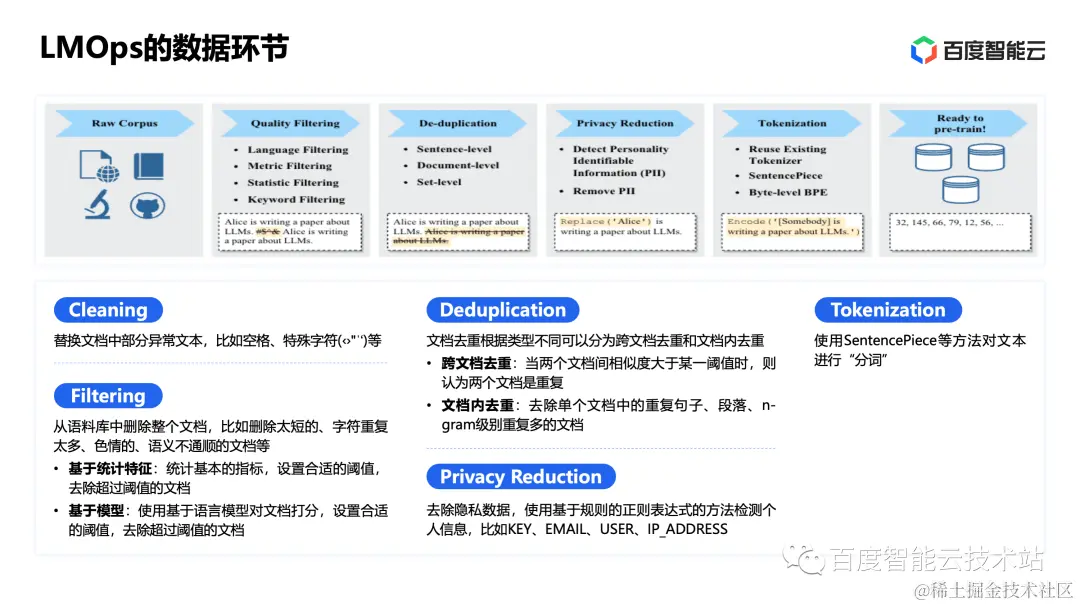 在数据加工的环节上,大模型在预训练和再训练的阶段,往往使用的是大规模未标注数据。因此,对这些大规模未标注的数据进行加工和配比,对大模型的效果至关重要。数据加工环节包括五个步骤: