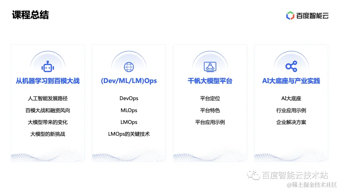 本次课程为大家全面分享了从机器学习到百模大战的发展路径、LMOps 相关概念和关键技术、以及千帆大模型平台的特点,以及产业实践四个方面的内容。