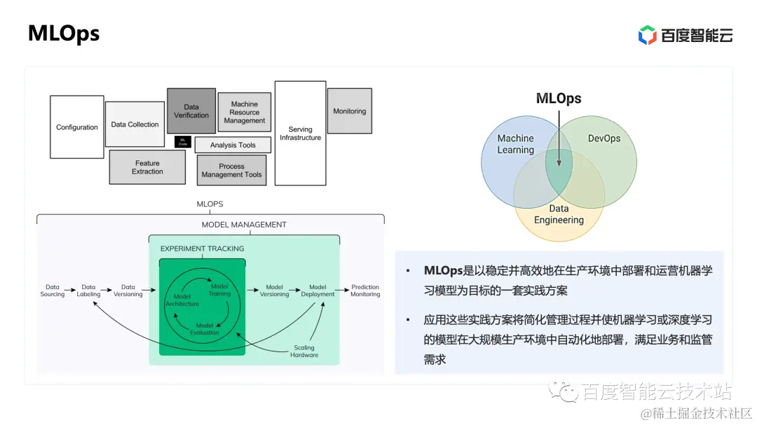 MLOps 涉及机器学习、 DevOps 和数据科学的相关技术,覆盖机器学习的需求分析、数据采集、加工、模型算法开发、训练、效果评估、调优、版本管理、服务部署、推理监控以及模型持续迭代等全生命周期的过程。