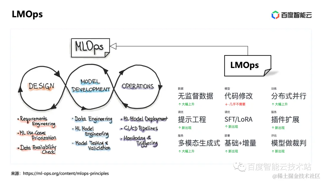 如上文所述,相对于传统机器学习和经典的深度学习模型,大模型发生了较大的变化,带来了新的挑战。LMOps 继承了 MLOps 整体的框架和机器学习的全生命周期等主要环节,并且针对大模型的变化进行了微调适配。