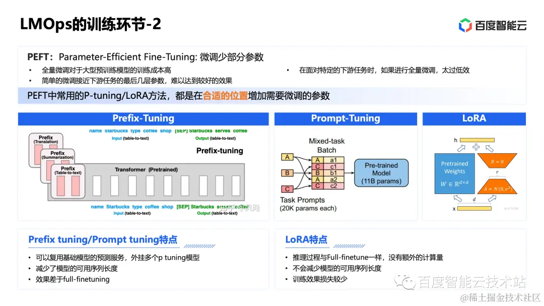 大模型的参数量一般在十亿甚至百亿、千亿、万亿以上。如果按照传统的机器学习模型或经典的深度学习模型,对大模型的全量参数进行调优(再训练)会造成资源开销超负荷。并且,对大模型的全量参数进行调优,可能会把预训练的模型训坏掉,丧失大模型原有的能力和效果。针对此问题,研究者提出微量调优(针对少部分参数进行调优)的办法。所以,目前常用 PEFT 手段对大模型进行调优。