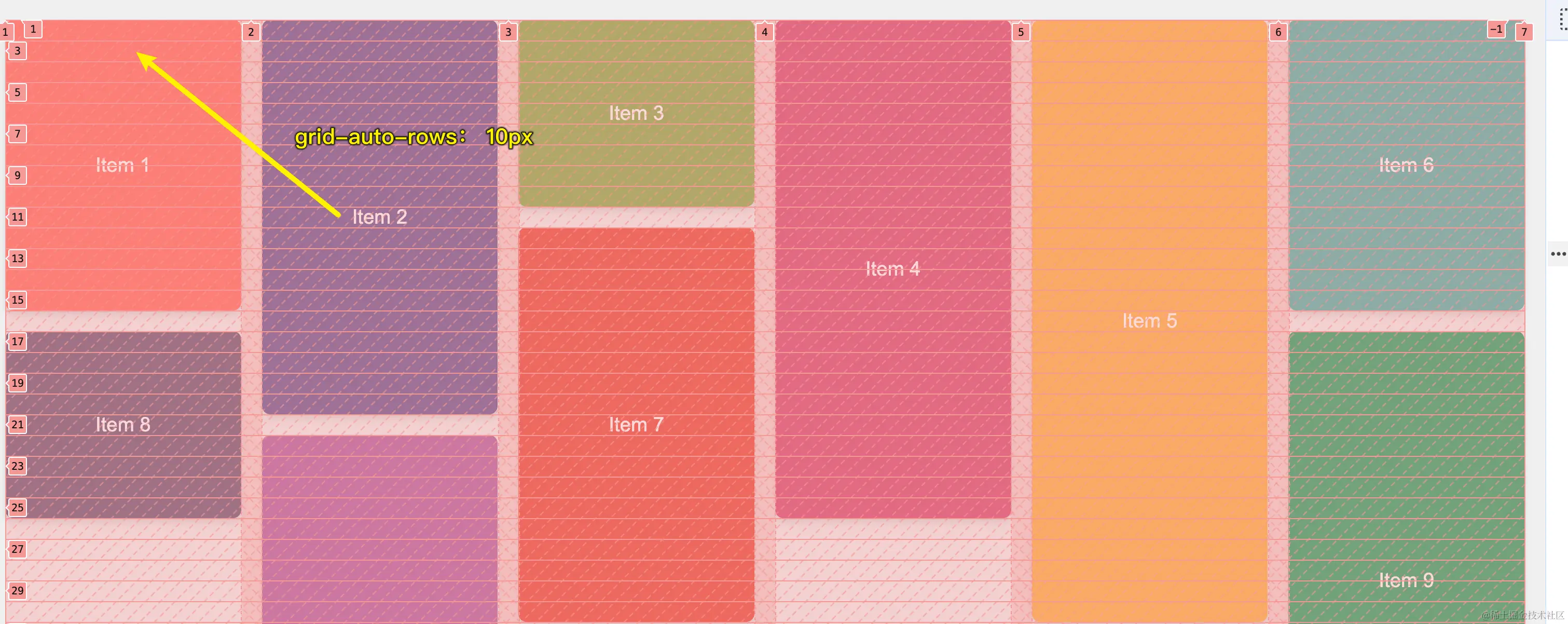 grid-auto-rows 定义网格容器中自动创建的行的高度。这将所有自动生成的行高度设置为 10px。在结合 grid-row 属性时,这会创建跨越多行的效果。